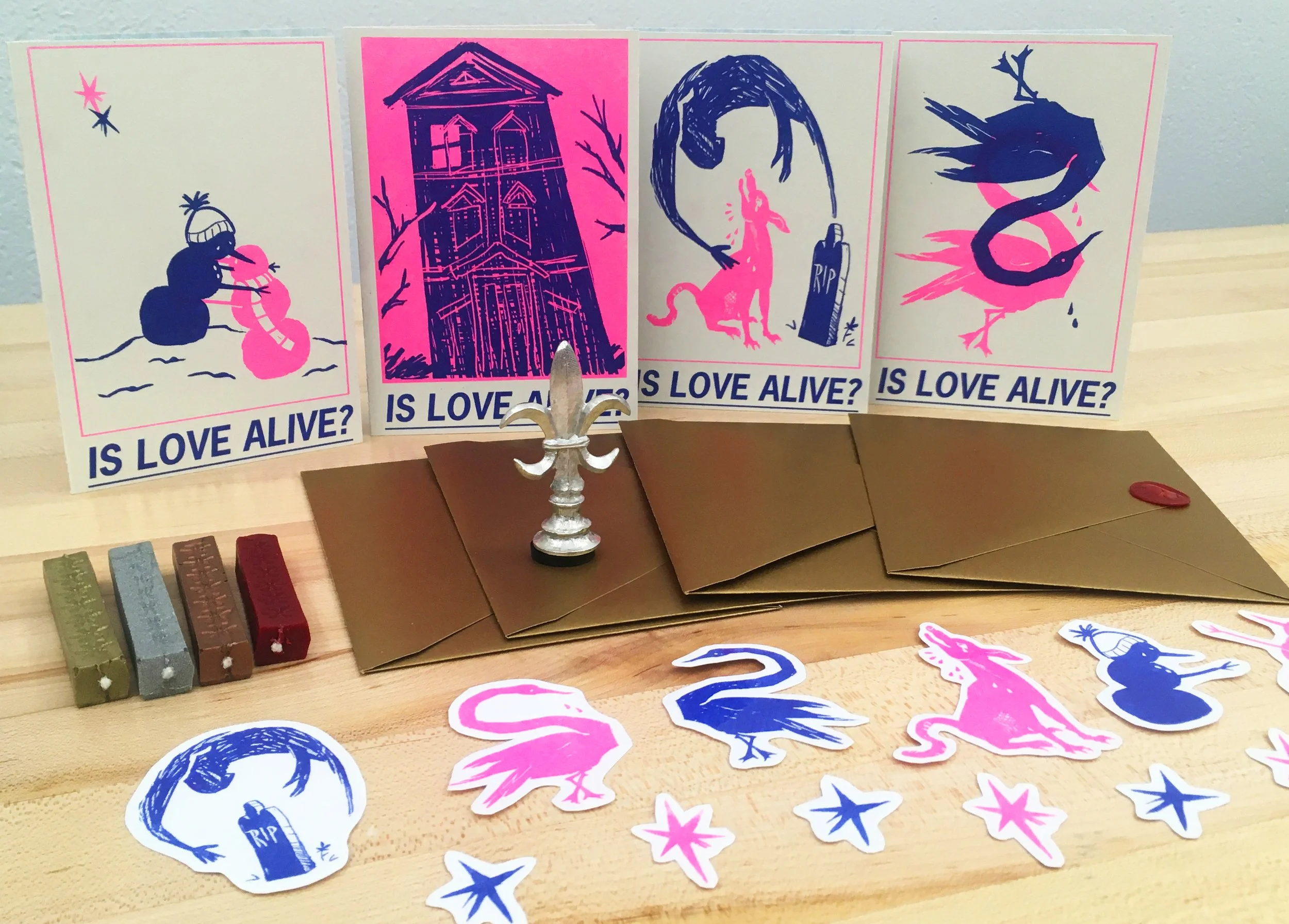 My cards were illustrated digitally and riso-printed in 2 colors on cardstock. The caption, “Is Love Alive?” is a lyric from Winter Song by Ingrid Michaelson and Sara Bareilles.